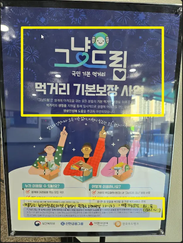 - 전국 통합 콜센터 이용: 국번 없이 '1688-1377'로 전화해 보세요. 현재 위치에서 가장 가까운 푸드뱅크나 '그냥드림' 운영 거점을 바로 안내받을 수 있습니다.